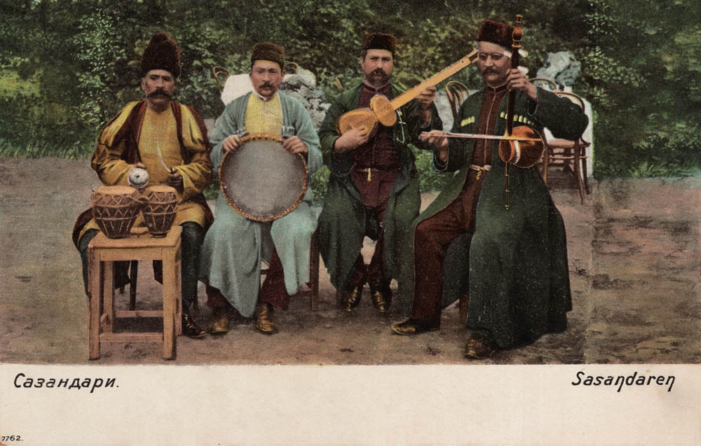 This early XX century postcard captures a group of Caucasian musicians — sazandars, folk performers and keepers of the musical traditions of Eastern Transcaucasia.
